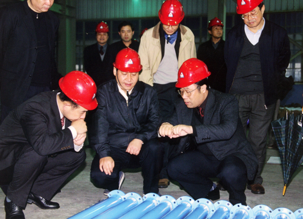2002年12月,時(shí)任浙江省委書記的習(xí)近平同志視察金洲管道生產(chǎn)園區(qū),在金洲集團(tuán)董事長俞錦方(右一)陪同下考察了鋼塑復(fù)合管、大口徑雙面涂敷鋼管生產(chǎn)線。